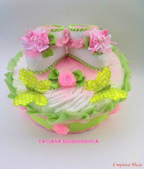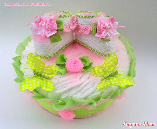 Здравствуйте Странамамочки! Хочу показать вам свою новую работу -пинеточки"Фея цветов" -подарок для девочки оформленный в виде тортика из памперсов. Пинеточки связаны спицами(№2), пряжа "Милк котон". Состав пряжи: 45%-хлопок 15%-шелк 40%-акрил из молока. Отделка крючком, пряжа Forever, микрофибра. Работа получилась в сочных зеленых, розовых тонах, наверно потому, что уже так хочется тепла, ярких цветов. Одним словом -мечта о лете