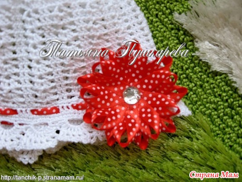 И вот тут мне в голову пришла идея: сделать цветочек в технике Канзаши. Тем более, что уже давно хотела попробовать себя в этом деле. Сказано - сделано! Ох, какая красота получилась, жаль было отдавать