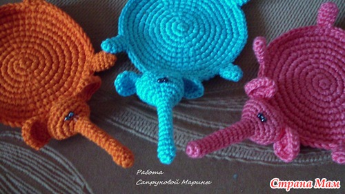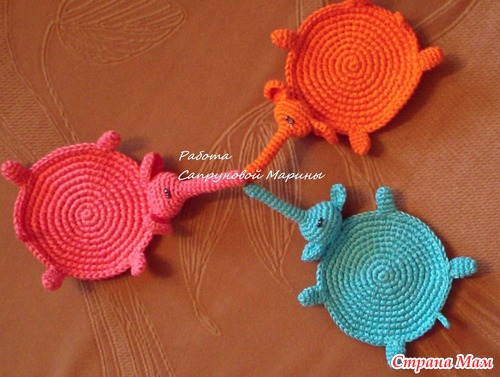 Веселые подставочки под чашечки. Первая и вторая партия была здесь https://www.stranamam.ru/post/2521510/ и здесь https://www.stranamam.ru/post/2353937/ (ну и в альбоме https://www.stranamam.ru/album/2570088/). Этих слоников вязала из "Нарцисса" крючком №2. Вязала без описания, по картинке (там еще много забавных идей) http://www.liveinternet.ru/users/semenihinasvetlana/post187987789/