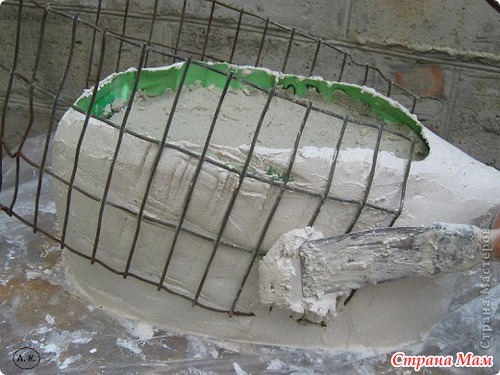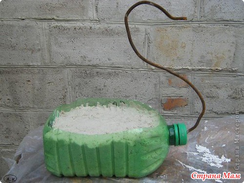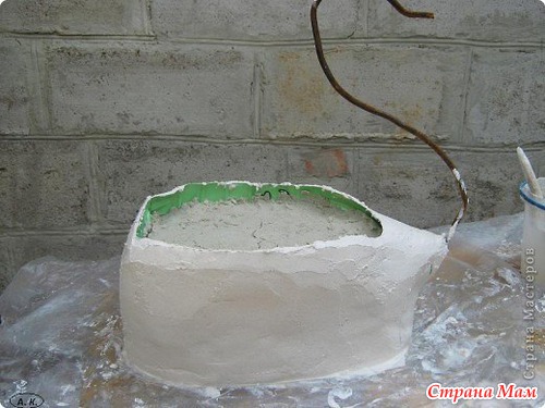 3. Место для работы покрываем полиэтиленом, делаем крутой раствор из шпаклевки и с помощью шпателя по размеру баклажки выкладываем раствором основание, формируя дно кашпо для цветов.
