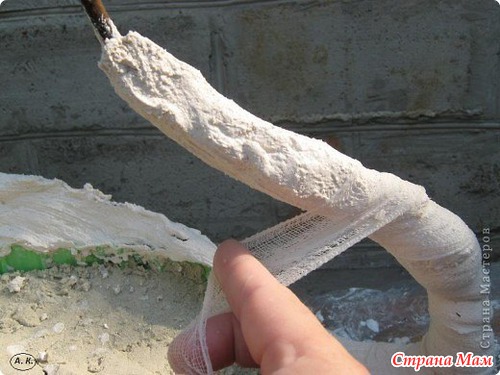 9. Продолжаем делать шею: шпаклевкой покрываем прут, обкручивая раствор мокрым бинтом