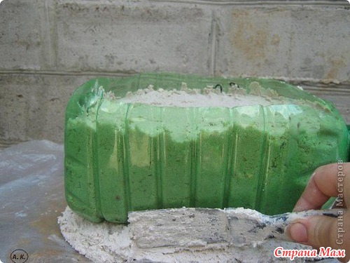 3. Место для работы покрываем полиэтиленом, делаем крутой раствор из шпаклевки и с помощью шпателя по размеру баклажки выкладываем раствором основание, формируя дно кашпо для цветов.