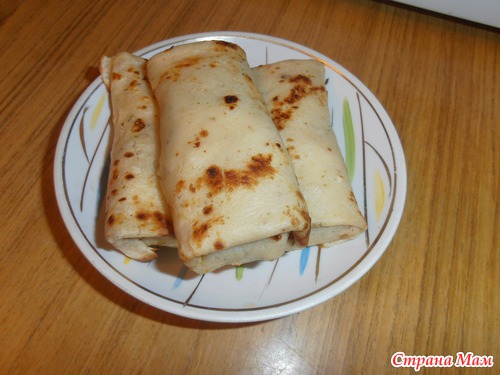 и у нас готова начинка, и мы эту начинку закручиваем в наши теплые блинчики
