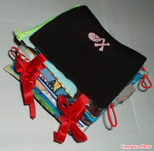 Обложка черная с пиратским знаком, сзади карман, книжка застегивается на кнопку, листы собираются на ленты.