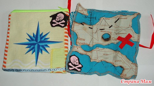 Страничка Карта Разворачивается карта на завязках. По карте ищем сокровища. Можно рассказать ребенку как обозначается суша и вода, а также маршруты. Идея взята из интернета