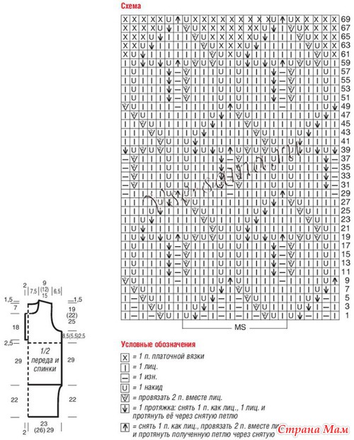 Ажурный узор: число петель кратно 12 + 1 +2 кром. Вязать по схеме, на которой приведены только лиц. р., в изн. р. петли вязать по рисунку или как указано, накиды вязать изн. Начинать с 1 кром. и петель перед раппортом, повторять раппорт, заканчивать петлями после раппорта и 1 кром. Связать 1 раз с 1-го по 70-й р.