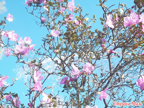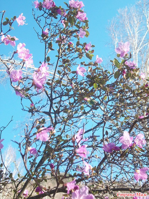 И самое главное - маральник (богульник) Весна наступает, как только начинает цвести маральник. Это не передаваемая красота, куда там Япония со своей сакурой. Раньше, в нашем детстве, маральника было не так много, кое - где на горах виднелись фиалетовые кустики, было много овечек и коз, они съедали весь кустарник, Сейчас скот держут меньше, маральник разросся, теперь это полностью фиалетовые горы. Это маральник в близи