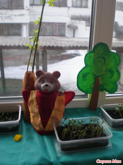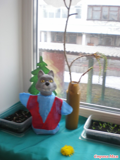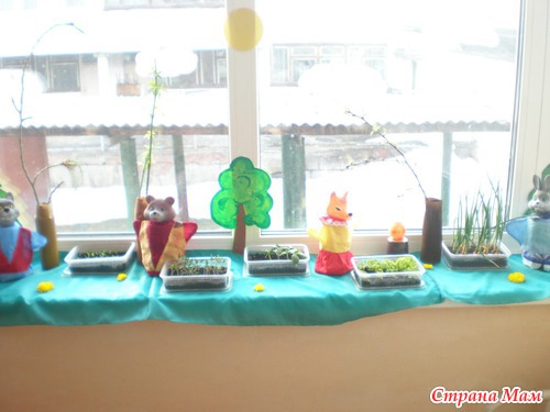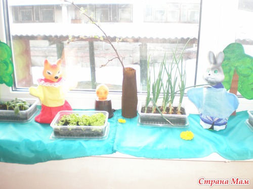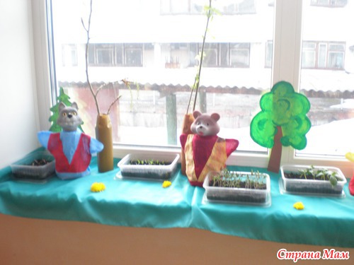 Проводили в саду конкурс - огород на подоконнике. Ну наш огород занял третье место, я думаю из-за оформления. сначала хотела деревенский домик с огородом сделать, но потом не стала - уж очень обычно и мне понравилась идейка - сюжет сказки колобок. Оформила все буквально за час (правда деревья рисовала заранее).