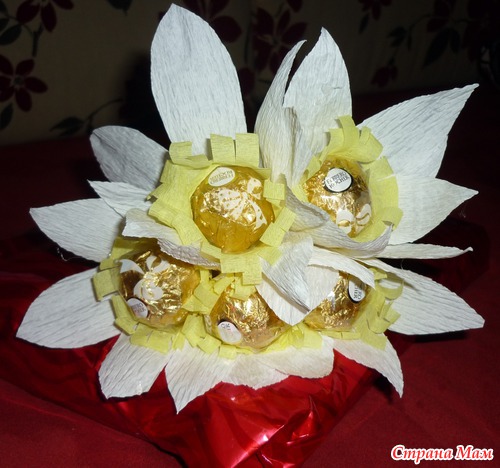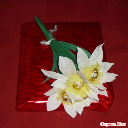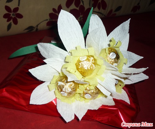 Мне очень давно нравятся конфетные букеты и вот захотелось попробовать сделать такой букет самой, а тут как раз и случай удачный подвернулся - день рождения подруги. Решила, в дополнение к подарку, сделать нарциссы. И вот, что у меня получилось:
