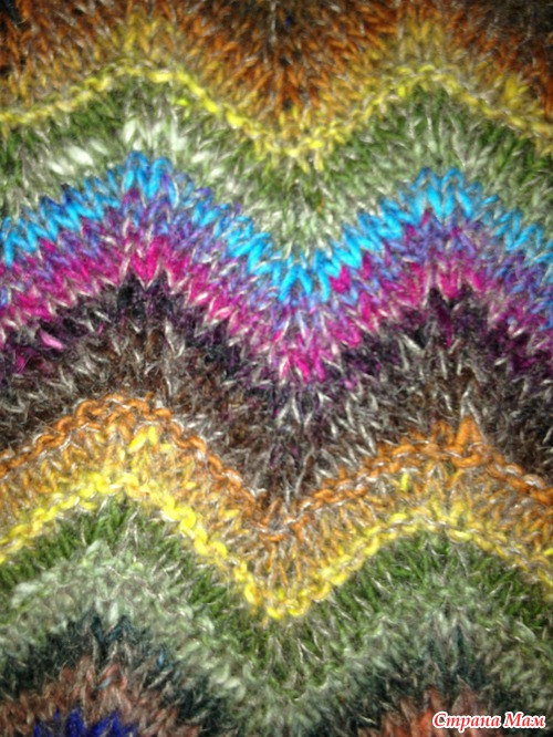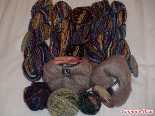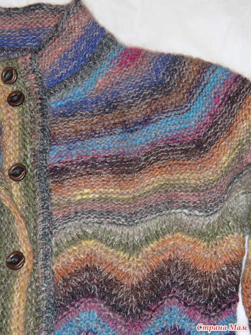 Нитки такие красивые, что моделька придумалась сама собой. Когда образец связала, захотелось немножко смягчить цветовые переходы, а это очень здорово получается при помощи тонюсенького мохера. Цвет мохера подбирала опытным путём, т. к. основная ниточка имеет очень разные оттенки, то добавку выбрала самую нейтральную цвета "капучино".