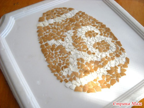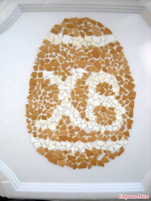 Делали вместе с племянником панно Пасхе. Использовали потолочную плитку(основа) и яичную скорлупу. Скорлупу клеили на клей ПВА, предварительно сняв пленочку. Очень интересная работа по созданию мозаичного панно. Племянник в восторге от проделанной работы.