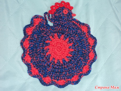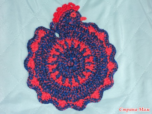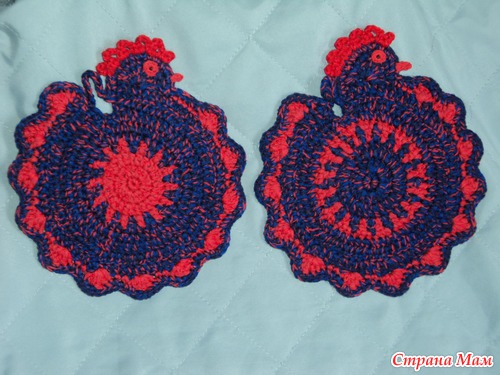 По большой просьбе связала вот таких курочек (как правило, на заказ практически не вяжу). Расцветка явно не куриная, но так попросил заказчик - под цвет кухни. Правда, было пожелание - сочетание красного с чёрным, но на мой взгляд, как -то траурно, а вот синий с красным пожизнерадостней будет... Кухня в красных тонах.