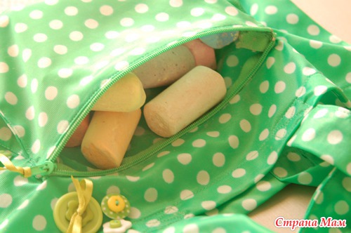Помимо игрушек для песочницы, в сумочке еще припасены мелки, для них специально сшила карман.