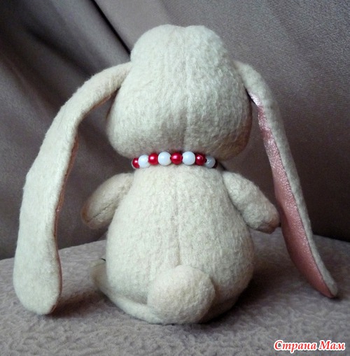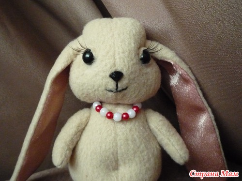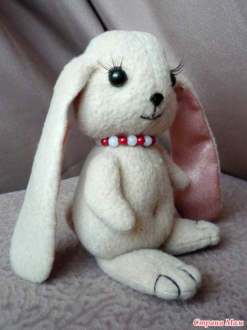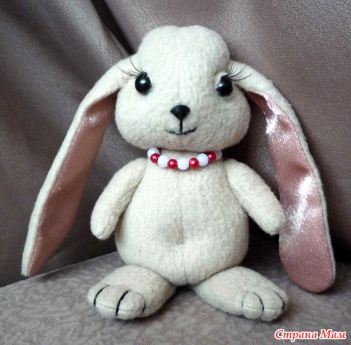 Вот такого заеньку недавно сшила. Нашла выкройку в интернете. Шьется легко. Повозиться пришлось с глазками. На предложенной выкройке у зайки глаза простые бусинки, мне же захотелось сделать глазки с ресничками. Пришлось покупать накладные ресницы, выкраивать веко, черной выпуклой пуговки на ножке не нашлось во всем городе, обошла все отделы рукоделия, либо вообще нет пуговиц, либо есть на ножке, но плоские. С плоскими я уже имела опыт, когда шила зайца с "музыкальными ушами", теперь решила поэксперименторовать и сшить с бусинкой. Глаза получились большие. Но вроде ничего смотрится. Как находите? Критика принимается.