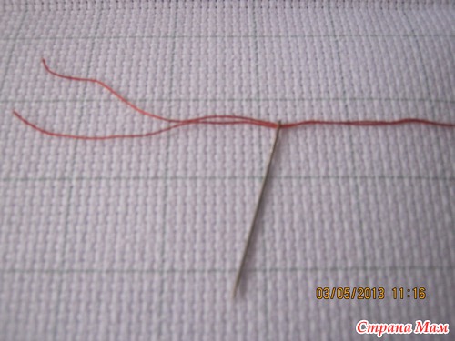 Сначала берем ниточку (допустим мы вышиваем в 2 нити). Берем только 1 нить и складываем ее вдвое: