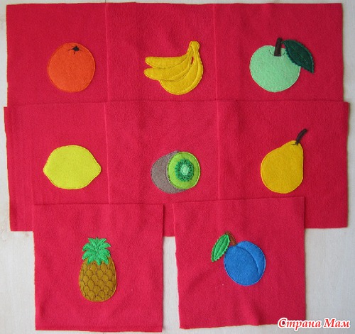 Здесь такая задумка: подобрать и соединить отдельно фрукты и отдельно овощи. Скажу, что мне не понравилось. Соединить такие полосочки узелком даже взрослому трудно, а деткам, можно сказать, невозможно. Не сумев выполнить задание, они просто потеряют интерес. Я сама работаю с малышами (домашняя группа адаптации к детскому саду) и знаю их возможности. Но по образованию я не дошкольный работник, поэтому мои слова ставятся под сомнение.