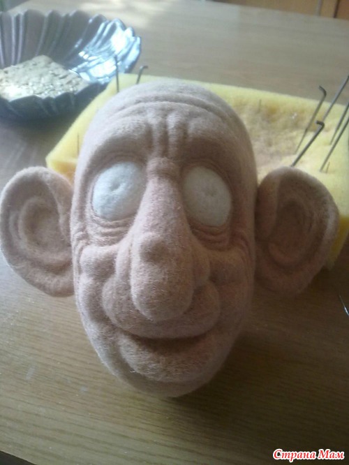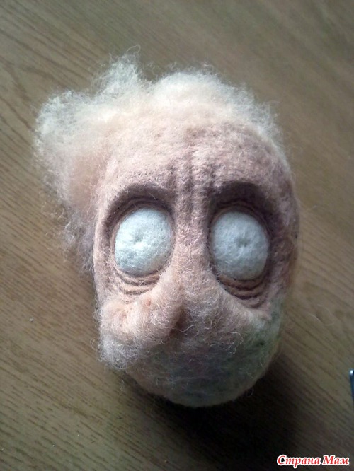 Наращиваю нос, бородавку))) формирую затылочную часть и шею из сливера до естественных пропорций. Затылок также обрабатывается бежевой шерстью, сильно не шлифую, там еще будут волосы, правда не на всей голове, дедушка то лысенький)))