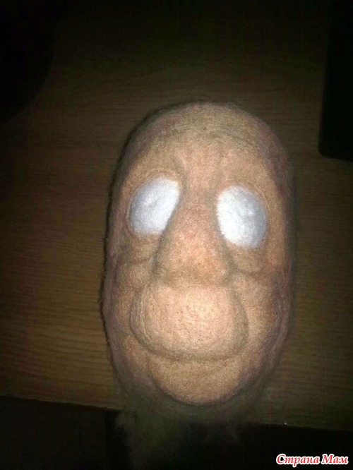 Многие мастера используют для наполнения основы синтепон, я использую сливер (неокрашенная грубая шерсть, она намного дешевле цветной). Из сливера формируем приблизительный овал лица иглой № 36 до плотного состояния, после этого можно по болванке пройтись еще и 38 иглой для уплотнения волокон. После этого размечаем для себя зрительно, где будут находится глаза, делаем для них небольшие углубления подходящего размера и формы (кто-то предпочитает недовалять болванку и потом в процессе создания глазниц проваливать их внутрь, я предпочитаю основу довалять до состояния нерушимости))), а потом уже наращивать надбровные дуги, так больше гарантии, что и доваляно будет и пропорции лица сохранятся). Сначала полностью заполняю бежевым цветом лицевой участок (задняя часть не заполняется цветом, она еще будет наращиваться сливером до необходимой формы).