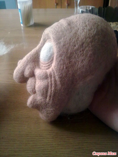 Формирую ушки (для меня чуть ли не самая сложная деталь в скульптуре, деталь плоская, но делать нужно не на губке, а на руках, пальчики сразу дырявятся). Делала так: формировала из бежа овал Нужная часть овала наращивается дополнительно шерстью (формируется валик по краю уха), потом вогнутая часть уха вовремя обработки как бы на пальцах продавливается вглубь (как лепить), по краю вогнутого участка формируем валик. Со стороны крепления к голове оставляем необработанный край для приваливания к голове. Приваливаем ушки к голове. Ура))) голова готова)))