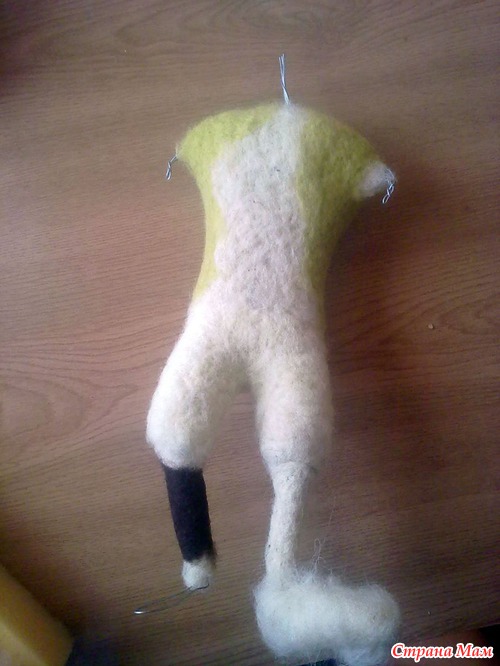 Приступаем к формированию каркаса для туловища. К сожалению фото голого каркаса не сделала. Расскажу на словах. Отмериваем на глаз проволоку длиной с шею (эта часть уйдет в голову) Изгибаем на плечо, возвращаемся к шее, делаем второе плечо (если проволока тонка, то стоит сделать несколько повторов для прочности, не забываем шею и ту часть, которая будет внутри головы, от этого зависит устойчивость головы). Если руки без каркаса, как делала я, то на руку я проволоку не пускала, только плечевой участок сделала немного длиннее необходимого, чтобы потом на него как бы нанизать руку. Далее возвращаемся проволокой к шее и от нее делаем позвоночник (если тонкая проволока можно в несколько слоев, потом шерстью туловище, конечно уплотнится, но плотный каркас не помешает), на уровне бедер формируем как и плечи каркас для бедер и ног. Наращиваем объем сливером и начинаем обрабатывать цветной шерстью.