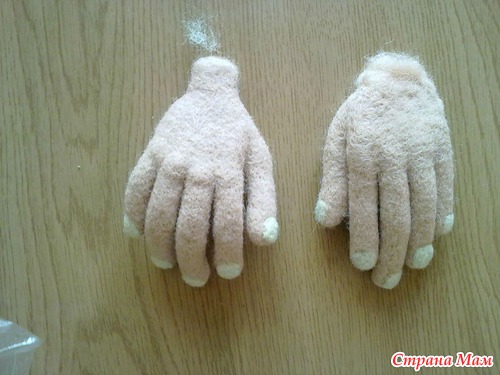 Формируем из бежевой шерсти кисти рук. Пальцы формируются из пряди шерсти обрабатываются по спирали (образуется колбаска, чтобы ее согнуть в нужном направлении, с внутренней стороны сгиба нужно обработать иглой, при этом сгибая заготовку пальца) В месте перехода пальца в ладонь оставляем необработанный участок шерсти. Делаем ногти и собираем пальцы в ладонь, наращивая постепенно в районе оставленных необработанных кончиков. Приваливаем большой палец. формируем кисть бежевой шерстью небольшой участок, который будет виден из манжета сюртука.