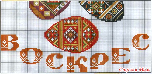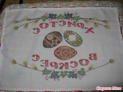 Сразу признаюсь - вышила не все 100% (как говорится одной ночи не хватило), но после праздников обязательно добавлю веточки вербы внизу и серединку зеленого яйца зашью, только еще не решила как (может сине-голубым??)