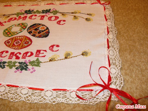 Нитки подбирала сама, как душе нравилось. Цвет одного из яиц измелина кардинально. Круживо пришивала уже вручную вчера в 23.20, а сегодня протянула сквозь кружила атласную ленту (ширина 0,3см)