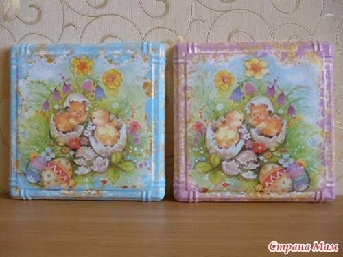А это сделала панно на подарок. Отлила гипсовые заготовочки, приклеила салфетку, края причпокала пакетом золотой, розовой или голубой краской. Покрыла акриловым лаком для саун.