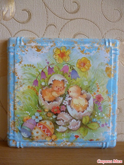 А это сделала панно на подарок. Отлила гипсовые заготовочки, приклеила салфетку, края причпокала пакетом золотой, розовой или голубой краской. Покрыла акриловым лаком для саун. Читать полностью