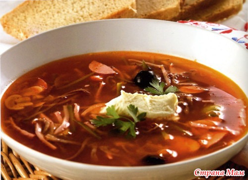 В готовый бульон(говядина или свинина....на выбор хозяйки)кладем картофель,нарезанный кубиками и пассерованную с томатной пастой морковь и лук.Затем соленные огурцы(нарезанные кубиками).Я не солю солью...делаю это рассолом.Потом ближе к концу,кладем колбасы.Я беру один вид варенной колбасы,один копчен.нарезаю на брусок(палочки прямоуг.)И кладем в суп.Зелень и специи по вкусу. Еще нужен лимон и оливки(черные)