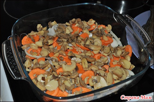 Выкладываем порезанный лук, морковь и грибы. Солим немного.