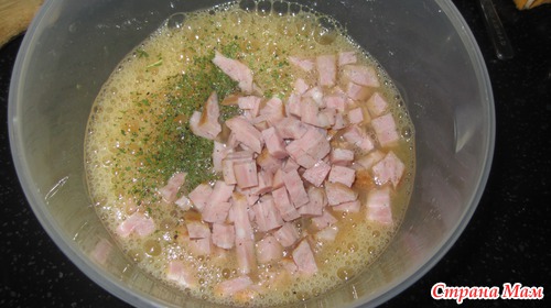 Яйца взбить, посолить, добавить порезанную колбаску и зелень (укроп, петрушку)