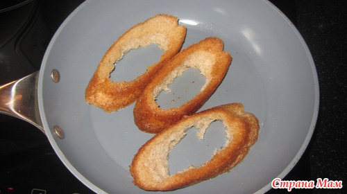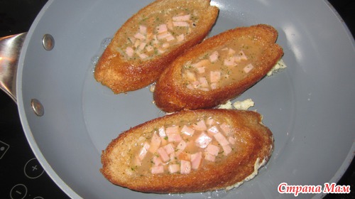 Обжаривать на среднем огне пока яйца сверху слегка не загустеют, затем резким движением перевернуть батоны на другую сторону и так же обжарить до румяности