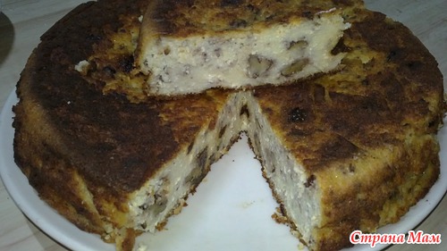 Взять 5 сырых яиц, добавить к ним еще 3 желтка, смешать со стаканом сахара, добавить ванилин. После размешивания всыпать стакан кукурузного крахмала и еще раз все перемешать до исчезновения комочков. Мягкое масло порезать кубиками, добавить к нему килограмм жирного домашнего творога и тщательно вымесить, чтобы все стало однородным. К творожной смеси прилить яично-крахмальную смесь, снова все перемешать. В тесто всыпать наполнители (орехи, чернослив, курагу и т. д). и все хорошенько перемешать. Застелить форму пергаментной бумагой и вылить тесто. Выпекать при 200гр минут 30, затем снизить до 180 и еще печь минут 30.