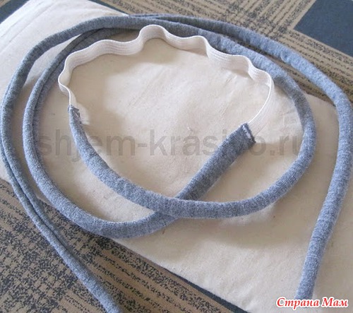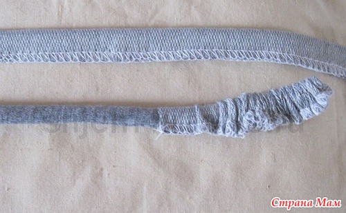 Стачиваю на “оверлоке” детали шнура – их две — по длинному срезу, выворачиваю и настрачиваю кусочек эластичной ленты на кончики одного из коротких срезов шнура (фото)