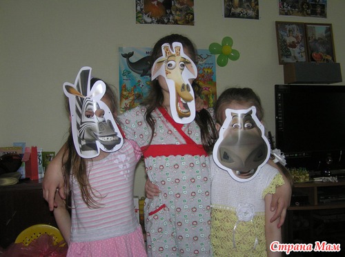 Когда немножко поели, пришло время поиграть. Раздала я всем деткам по маске с животными Мадагаскар (напечатала):