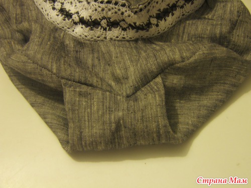 Околышек складываем пополам вдоль, застрачиваем вместе с кружевом, не забывая сзади вшить резинку. Потом пришиваем меньший круг к околышку. Потом пришиваем донышко. НО, по скольку донышко у нас больше, то лишнее собираем в большую складку так, что бы она тоже сзади была.