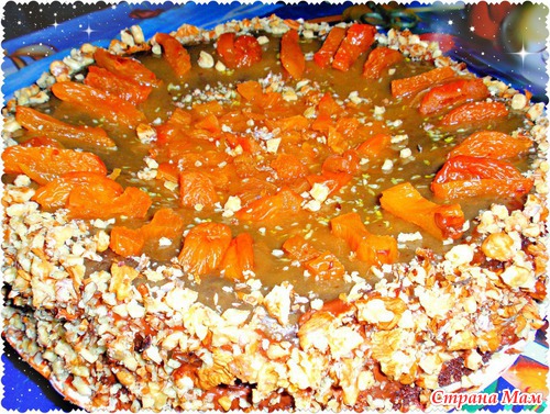 Растопить ириски с молоком и горячей глазурью залить пирог. Сверху украсить дольками кураги, бока — орехами.