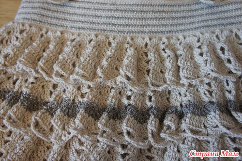 просто через одинаковое количество рядов вязала ряд только за заднюю стенку, чтобы было за что зацепить рюшку)
