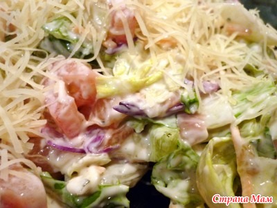 всё смешиваем (оставив немного сыра) и заправляем готовым соусом "Цезарь"