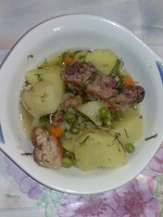 Курицу порезать на небольшие кусочки, посолить, поперчить,обжарить,сложить в кастрюлю.Засыпать мелко порезанным сырым луком,добавить подсоленной воды и тушить около 20 мин. Добавить лавровый лист, морковь кубиками, горошек, картофель, порезанный небольшими кусочками. Тушить на медленном огне до готовности картошки. Посыпать зеленью и снять с огня.