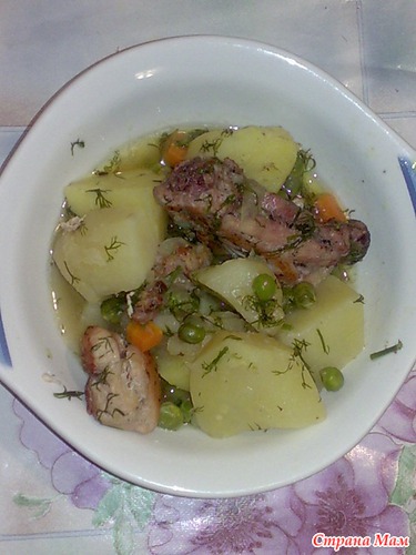 Курицу порезать на небольшие кусочки, посолить, поперчить,обжарить,сложить в кастрюлю.Засыпать мелко порезанным сырым луком,добавить подсоленной воды и тушить около 20 мин. Добавить лавровый лист, морковь кубиками, горошек, картофель, порезанный небольшими кусочками. Тушить на медленном огне до готовности картошки. Посыпать зеленью и снять с огня.