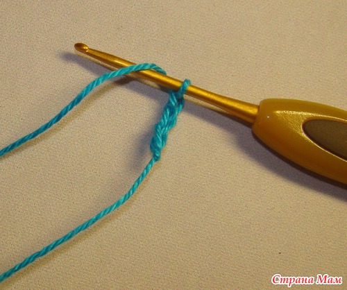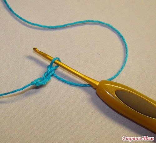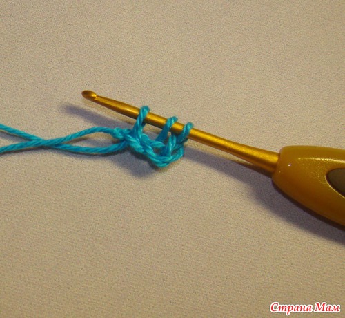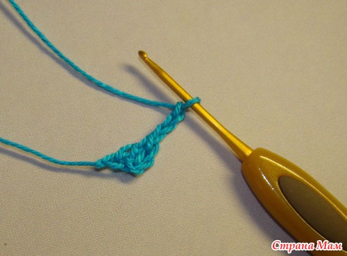 Далее я делаю три воздушные петли для подъёма и начинаю вязать первый ряд из ССН (столбиков с 1 накидом)