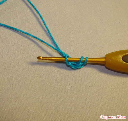 7) Снова захватываем нить, протягиваем её сквозь две петли. На крючке одна петля. Вот в неё потом мы будем вводить крючок в 9 шаге.
