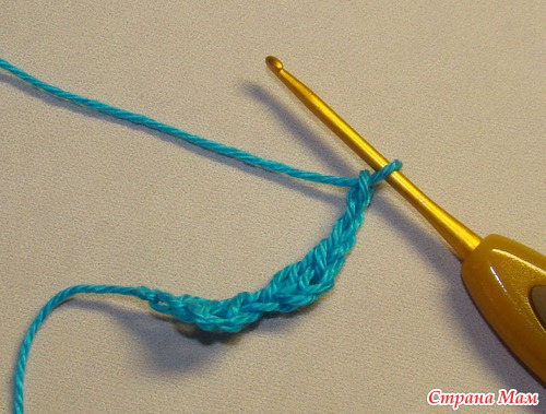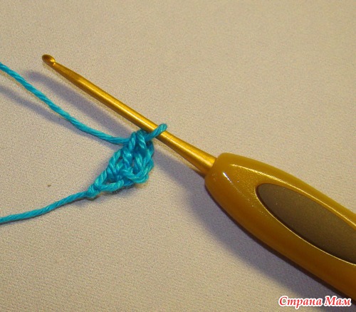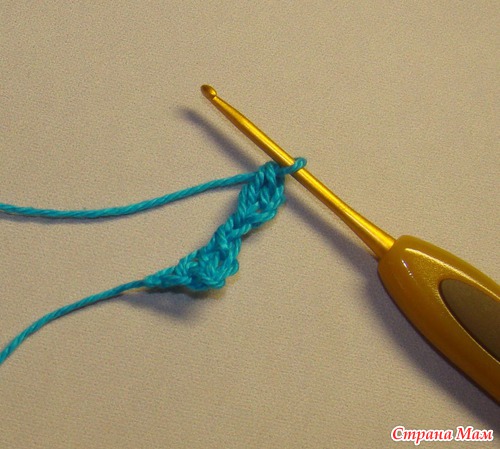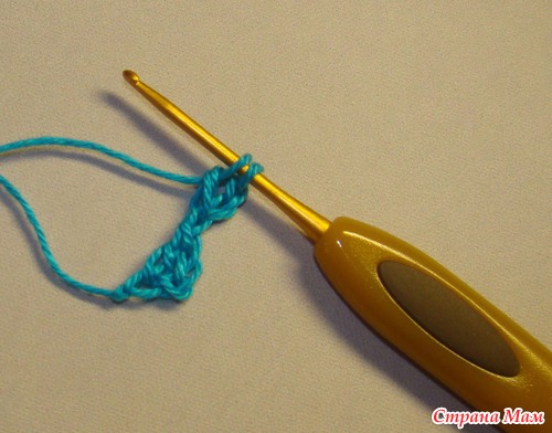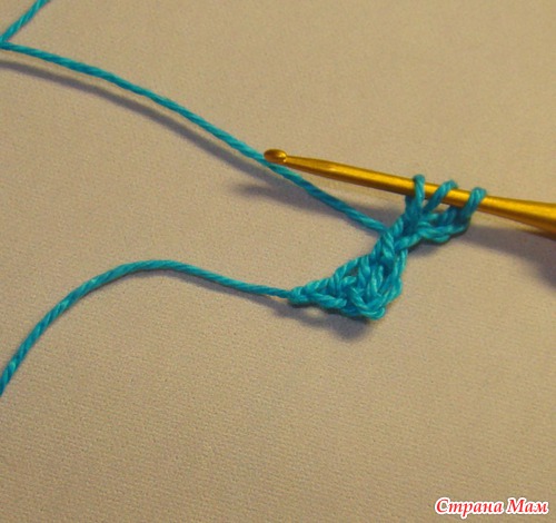 12) Опять набираем три воздушных петли и повторяем с 9 шага. Вяжем до нужного размера.