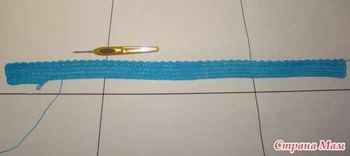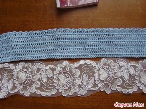 Примерим к нашей связанной полосочке. Я специально подбирала кружево, чтобы оно было чуть шире связанной полоски.