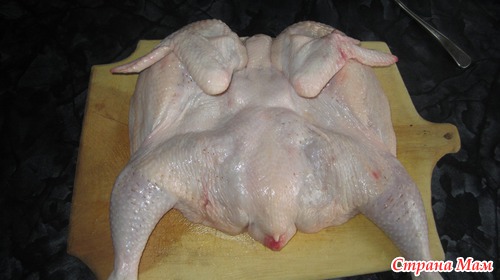 Тушку цыпленка вымыть, обсушить разрезать вдоль грудки. Вилкой хорошо протыкать грудку и бедра (не жалеть