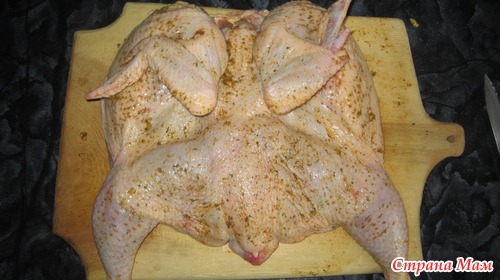 С обеих сторон смазать курочку смесью из: чеснок давленый, соль, перец, приправа для курицы