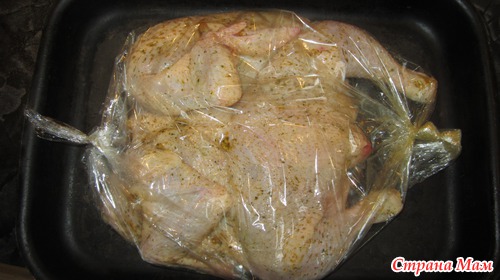 Уложить тушку в рукав для запекания, закрепить с обеих сторон. Сделать пару надрезов, что бы выходил пар