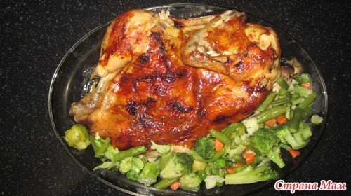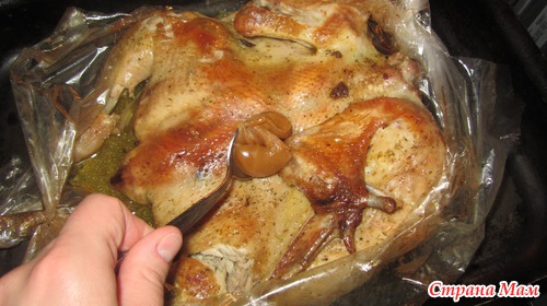 Запекать 1,5 часа при t 190 град. Минут за 10-15 до окончания разрезать рукав, открыть курочку, смазать медом и оставить румянится